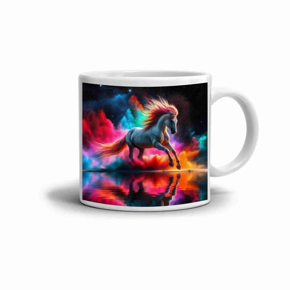 A bögrén egy dinamikus, színes ábrázolású ló jelenik meg mozgás közben, élénk árnyalatokkal körülvéve, amelyek erőteljes vizuális kontrasztot alkotnak. A motívum energikus és modern hatású, miközben megőrzi az egyensúlyt és a jól áttekinthető formát. A mozgás, a színek és a vízfelszínen megjelenő tükröződés együttese különleges karaktert ad a bögrének, amely a mindennapi használat során is figyelemfelkeltő.