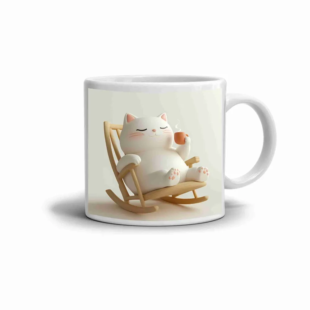 A bögre motívuma nyugodt és harmonikus hangulatot áraszt. A fehér macska, amely ringatózó széken pihen és kezében egy forró italt tart, a teljes elégedettség és béke érzését kelti. A lágy színek és a letisztult stílus modern, kellemes megjelenést kölcsönöznek a mintának, amely a nyugalom pillanatait idézi.
