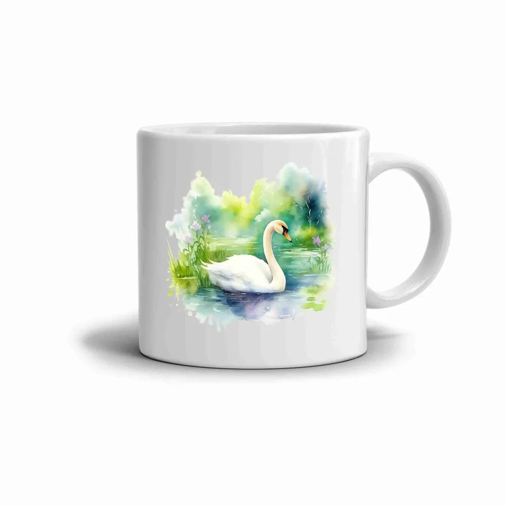 A bögrén egy gyönyörű hattyú látható, amint finoman siklik a nyugodt tó vizén, körülötte lágy zöld és kék árnyalatokkal. A festményszerű motívum romantikus és békés hangulatot áraszt, mintha egy nyári reggel csendjét őrizné. Ez a kép harmóniát és nyugalmat sugároz, amely minden kortyot különlegessé tesz.