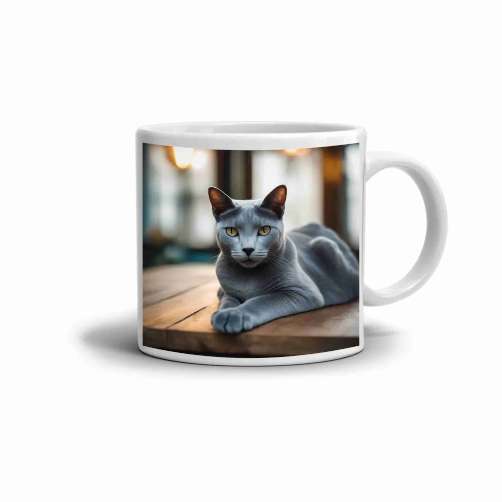 Az elegáns orosz kék macska motívuma finom és mégis feltűnő megjelenést ad ennek a bögrének. A sima vonalak, a jellegzetes kékesszürke szőrzet és a ragyogó borostyánsárga szemek harmonikus, nyugodt kompozíciót alkotnak. A dizájn kiegyensúlyozott, így a bögre otthon és munkahelyen egyaránt szépen érvényesül.