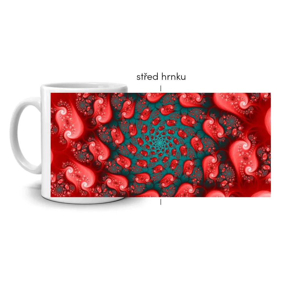 Az absztrakt motívum ezen a bögrén a formák és színek lenyűgöző játékával ragadja meg a figyelmet, amelyek egy spirális mintában forognak. A mélypiros és a türkiz kombinációja az energia, a mozgás és a mélység érzetét kelti. A dizájn modern, merész és mégis harmonikus, tökéletes azok számára, akik szeretik az eredetiséget és a dinamikát.
