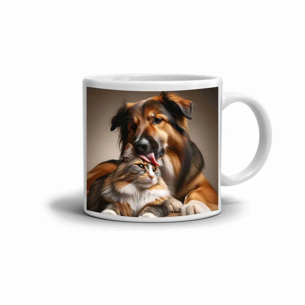 A bögre motívuma egy szeretettel teli pillanatot ábrázol, ahol egy kutya és egy macska békésen pihennek egymás mellett. A két állat gyengéd tekintete és puha bundája meleg, barátságos hangulatot teremt, amely már első ránézésre mosolyt csal az arcra. A lágy fény kiemeli a részleteket, és harmonikus, otthonos érzetet ad az egész kompozíciónak.