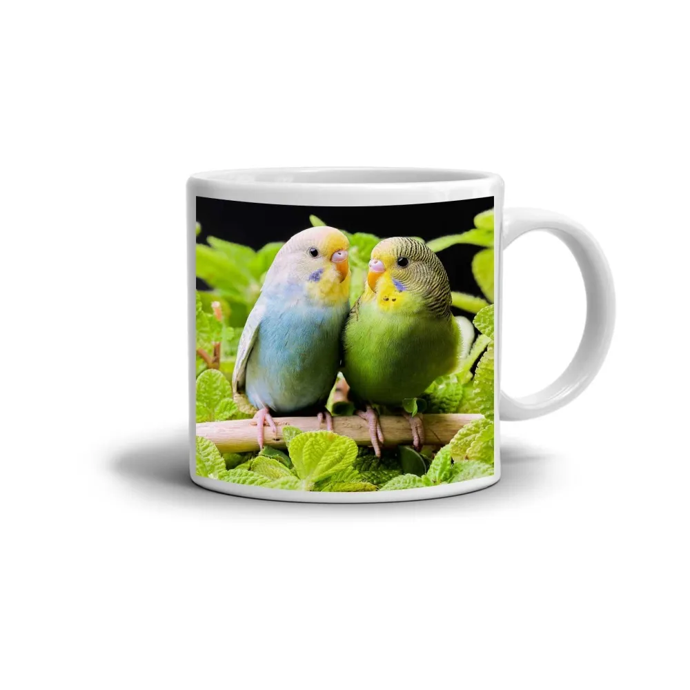A bájos két hullámos papagájos motívum gyengédséget, örömöt és barátságot sugároz. A finom kék, sárga és zöld árnyalatok szépen harmonizálnak, friss és optimista hangulatot teremtve. A tollak részletes kidolgozása kiemeli a madarak természetes szépségét és játékos jellegét. Ez a bögre örömet szerez mindenkinek, aki szereti a természetet, az állatokat és a pozitív energiát, amely feldobja a reggeleket.
