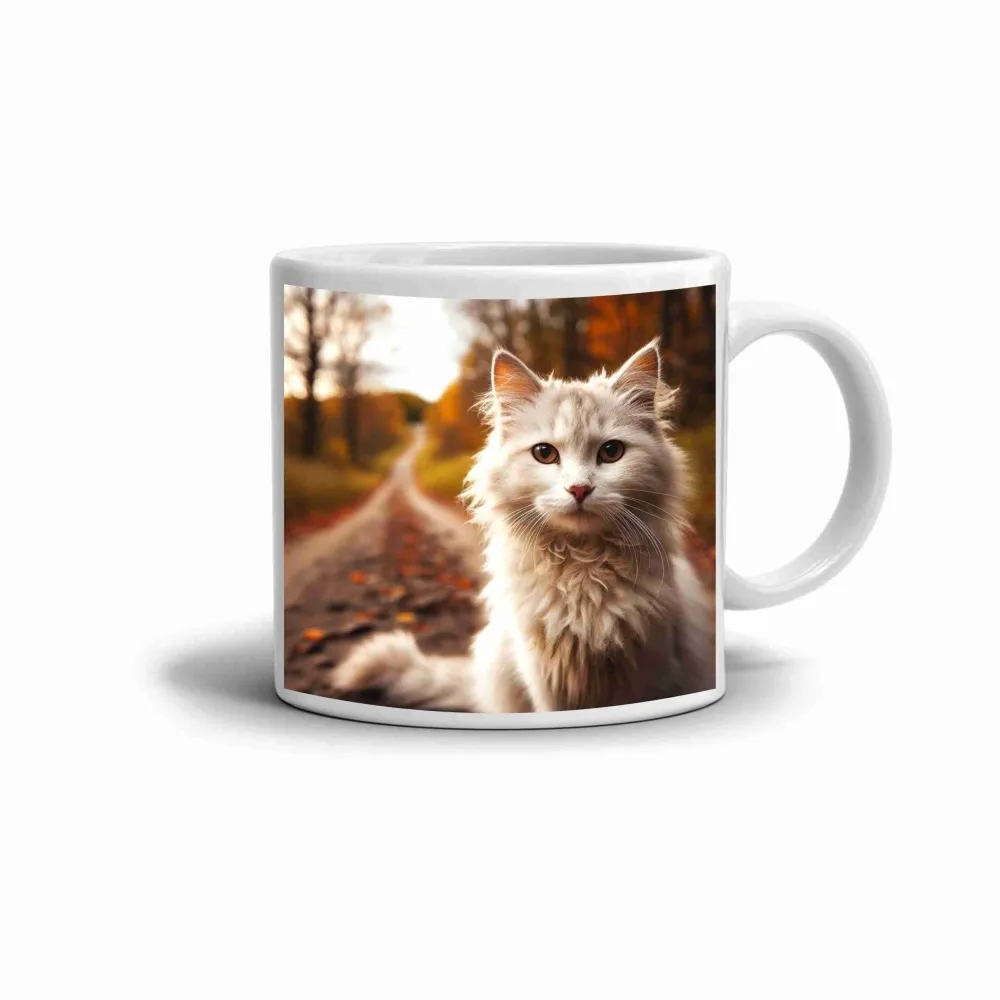A bögrén egy gyönyörű, hosszú szőrű macska látható, amelynek puha fehér bundája szépen kiemelkedik a háttér meleg, őszi színeiből. A macska nyugodt, mély tekintete harmonikus motívumot teremt, amely barátságos és meghitt hangulatot sugároz. A kompozíció elegánsan kapcsolja össze az állat szépségét a csendes, természetes környezet atmoszférájával.