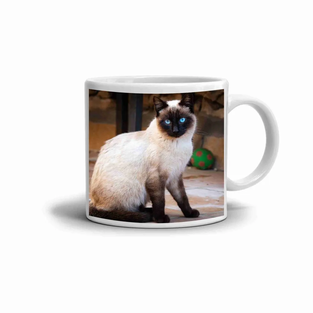 A gyönyörű sziámi macska elegáns megjelenése és különleges kék szemei teszik ezt a bögrét igazán figyelemfelkeltővé. A világos szőr és a sötétebb jegyek kontrasztja finom, mégis látványos motívumot alkot, amely minden macskakedvelő szívét megdobogtatja.