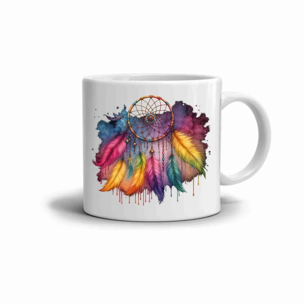 Ez a fehér kerámia bögre egy színes álomfogóval van díszítve, amelynek élénk színei és finom részletei harmóniát és inspirációt sugároznak. A minta egyszerre lágy és kifejező, így a bögre alkalmas mindennapi használatra és dekorációs elemként is.