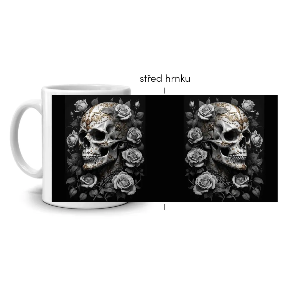 A sötét és hatásos motívum, amelyen egy koponya rózsákkal van körülvéve, lenyűgözi a nézőt mélységével és kontrasztjával. A fekete, szürke és arany színek kombinációja erőteljes vizuális hatást kelt, amely az erőt, a titokzatosságot és a szépséget egyesíti. Ez a bögre igazi művészi alkotásként hat, és minden használatkor különleges benyomást kelt.