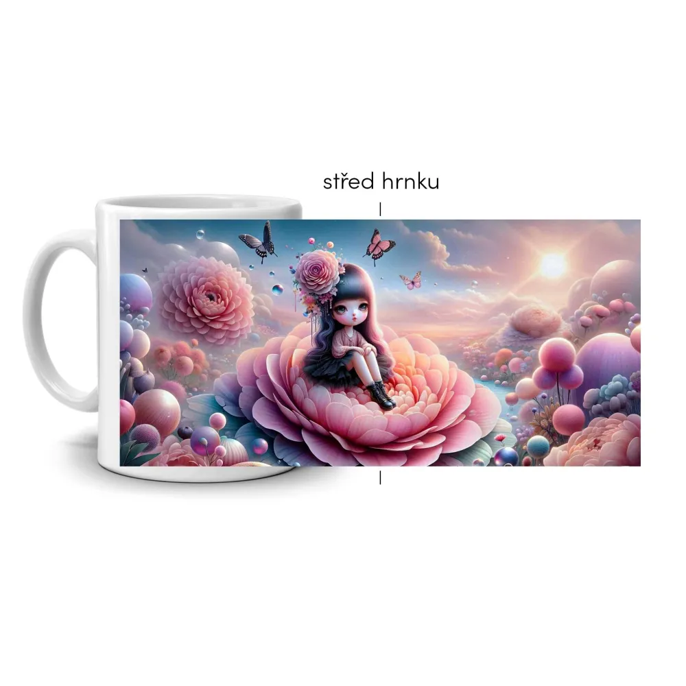 A finom és álomszerű motívum, amelyen egy virágon ülő kislány látható, a fantázia és a gyengéd szépség világát idézi. A rózsaszín és lila árnyalatok nyugalmat és álmodozó hangulatot teremtenek, miközben a pillangók és a fények költői atmoszférát adnak a jelenetnek. Ez a bögre olyan, mint egy kis darab mese, amely minden reggelt inspiráló és örömteli pillanattá varázsol.