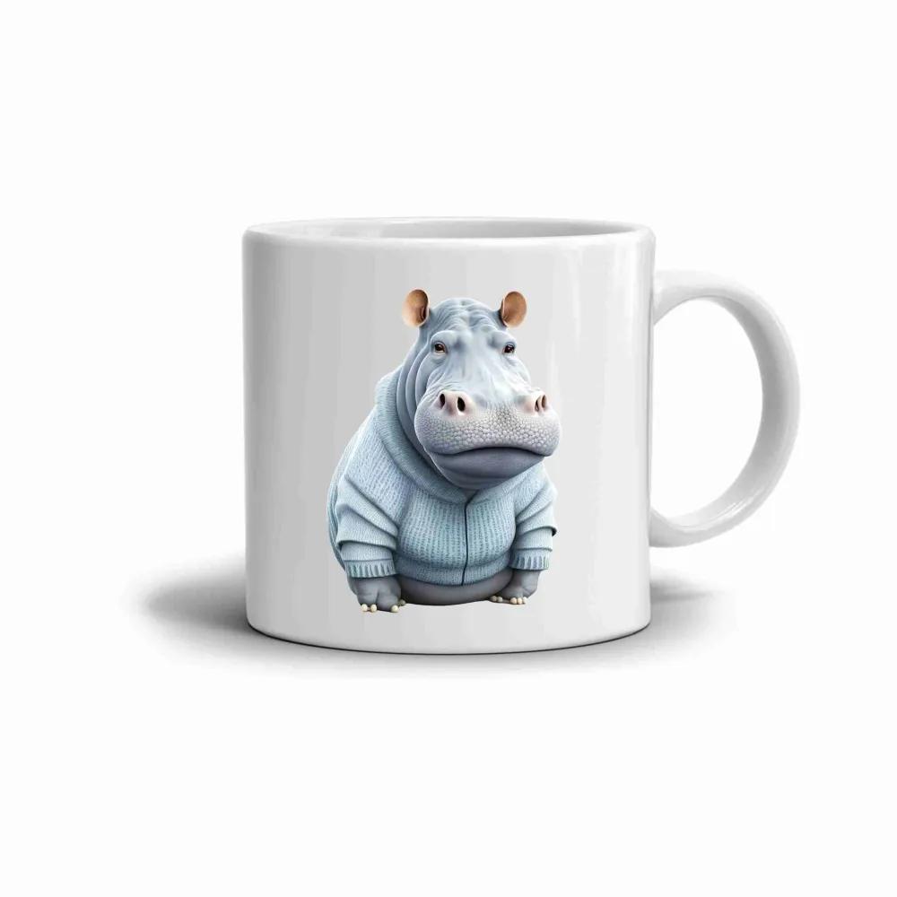 A bögre motívja egy aranyos vízilovat ábrázol kék pulóverben, aki nyugodt és barátságos benyomást kelt. A lágy kék árnyalatok és a részletes kidolgozás harmonikus, mégis vidám hangulatot teremtenek. Az egész motívum melegséget, kedvességet és egy kis játékosságot sugároz, így a bögre tökéletes társ a pihenés pillanataiban. Kiváló választás állatkedvelőknek és az egyedi design rajongóinak.