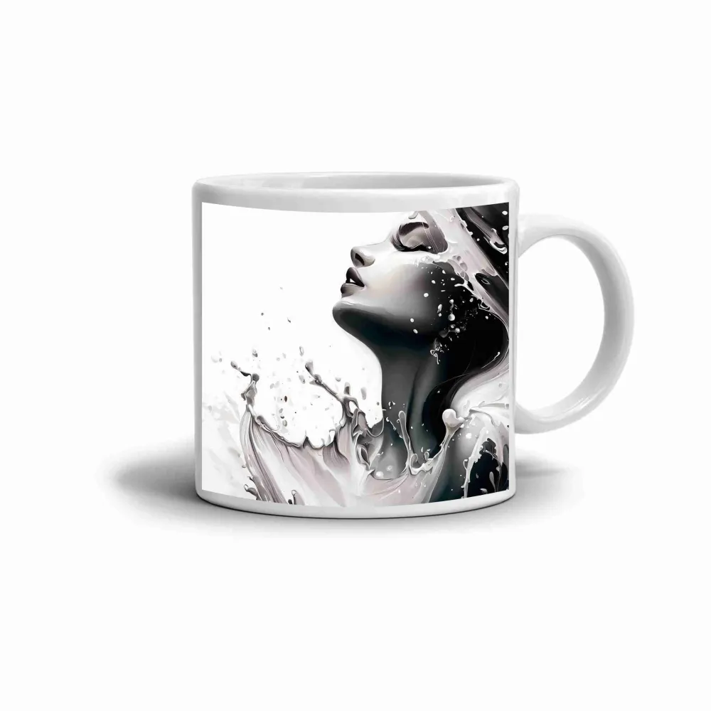 A fekete, fehér és szürke finom árnyalatai hatásos művészi motívumot alkotnak ezen a bögrén, amely egy nő alakját ábrázolja úgy, mintha egy folyékony festékáramba merülne bele. A lágy vonalak kiemelik nyugodt arckifejezését, a körülötte hullámzó formák pedig a mozgó cseppeket és a finom energiát idézik, amely modern és harmonikus hangulatot ad az egész jelenetnek. A kompozíció elegáns, letisztult és vizuálisan nagyon hatásos.