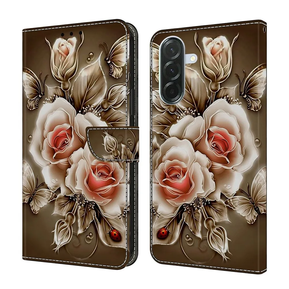 Határozottan pénztárca tok Samsung Galaxy A57 5G és barna rózsa motívumhoz