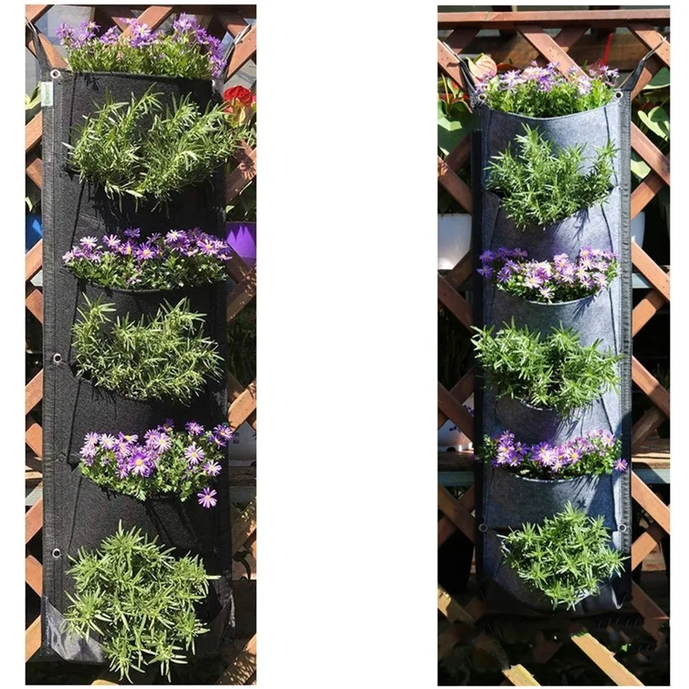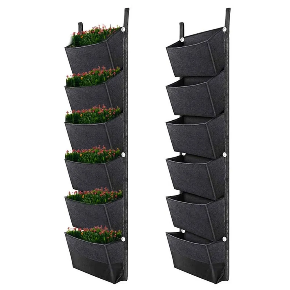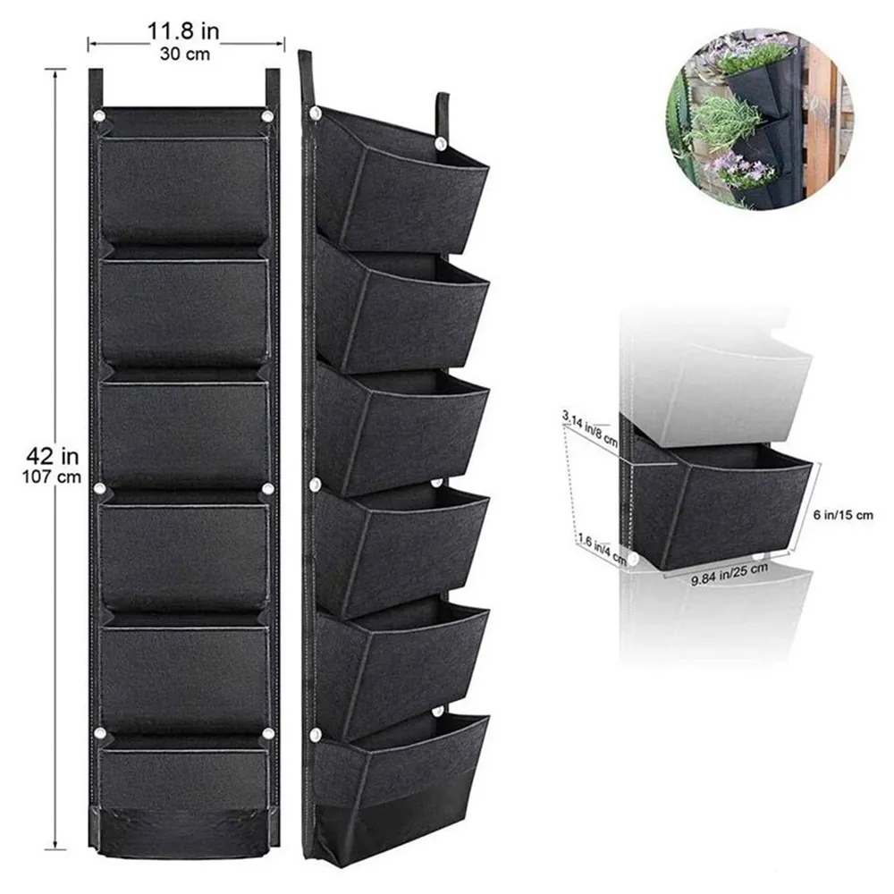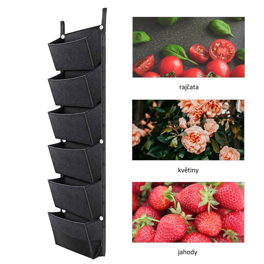 Fekete, függesztett, függőleges virágtartó 6 zsebbel, fűszernövények és virágok falra vagy erkélyre való termesztéséhez