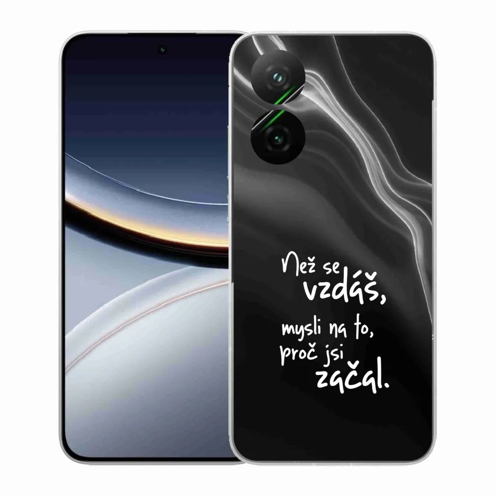 Rugalmas gél tok mmCase a Xiaomi Poco F7 5G képével - idézet 2 fekete háttérrel