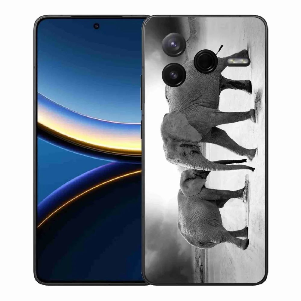 Rugalmas gél tok mmCase a Xiaomi Poco F7 Pro képével - fekete és fehér elefántok