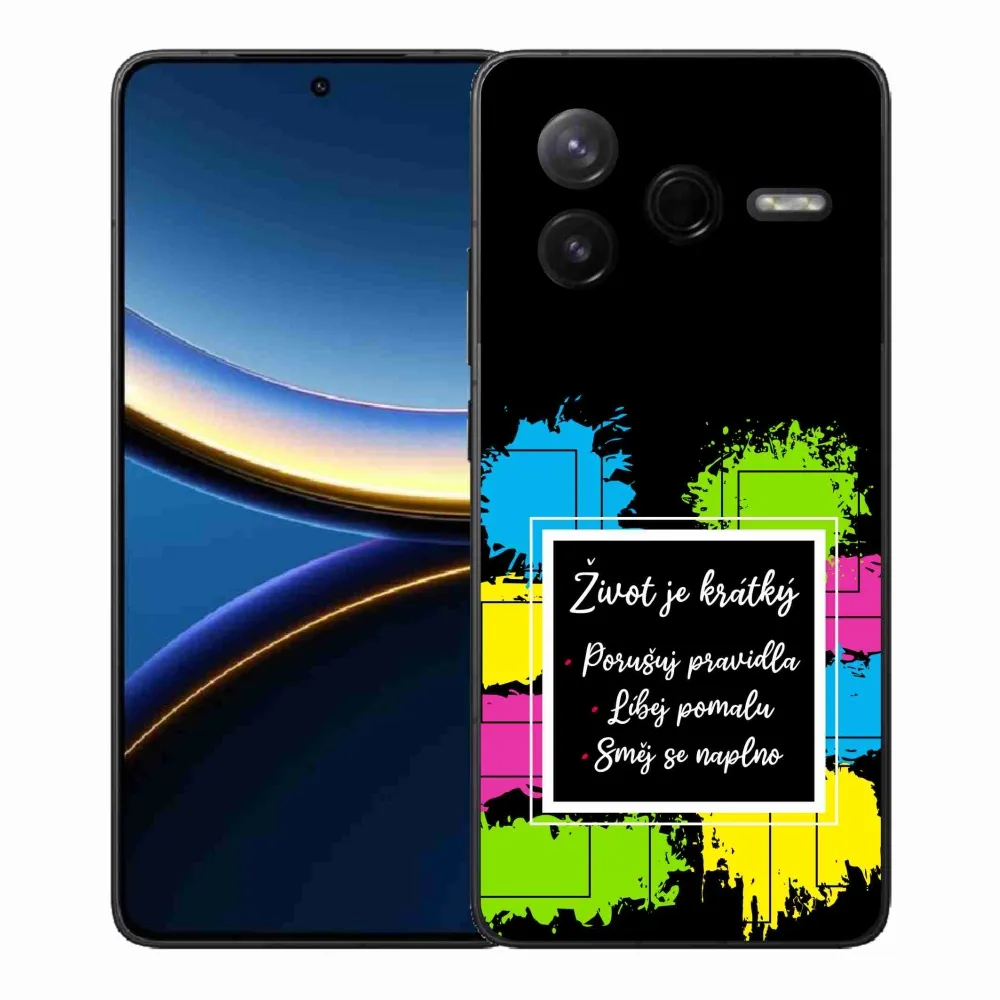 Rugalmas zselés tok mmCase a Xiaomi Poco F7 Pro képével - idézet 5 fekete háttérrel