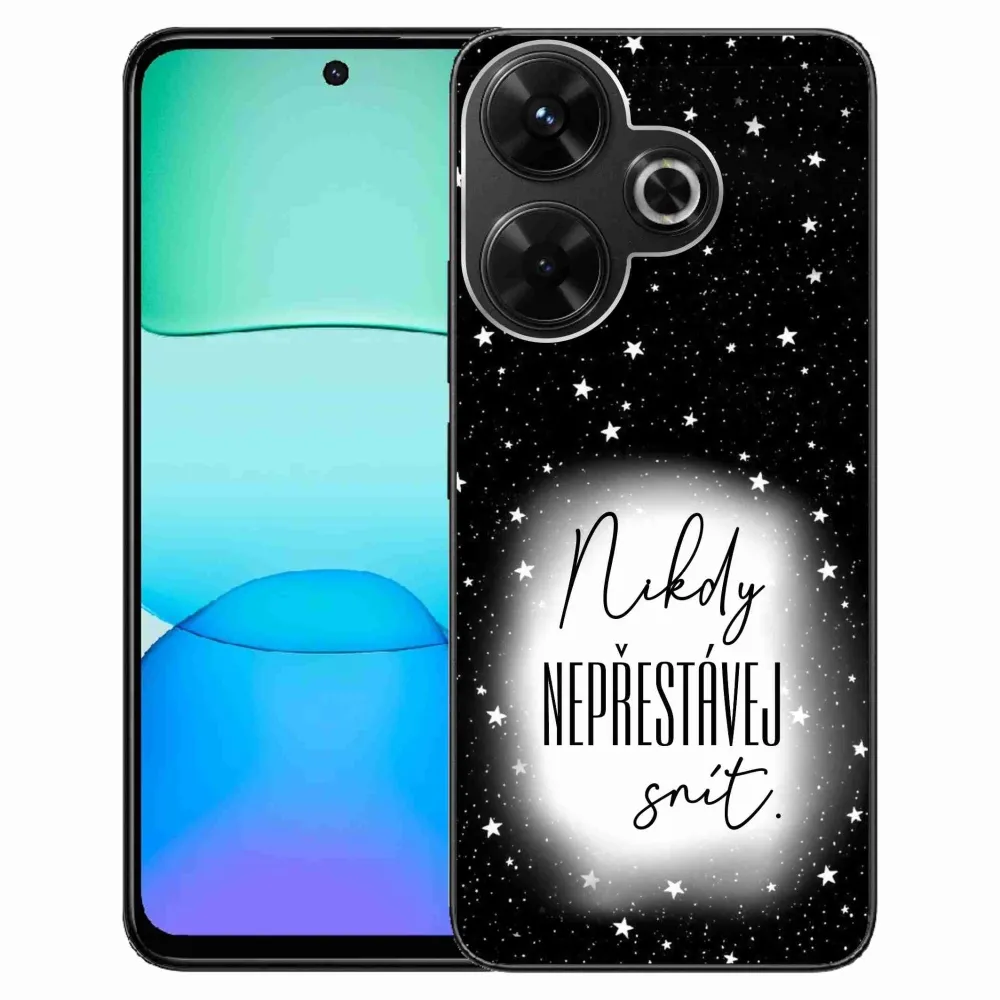 Átlátszó zselés tok mmCase a Xiaomi Redmi 13 4G/Poco M6 4G képével - idézet 1 fehér és fekete háttérrel