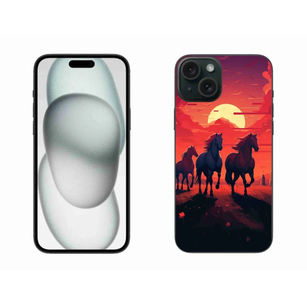Rugalmas zselés tok mmCase képpel iPhone 15 Plus készülékhez - lovak és naplemente