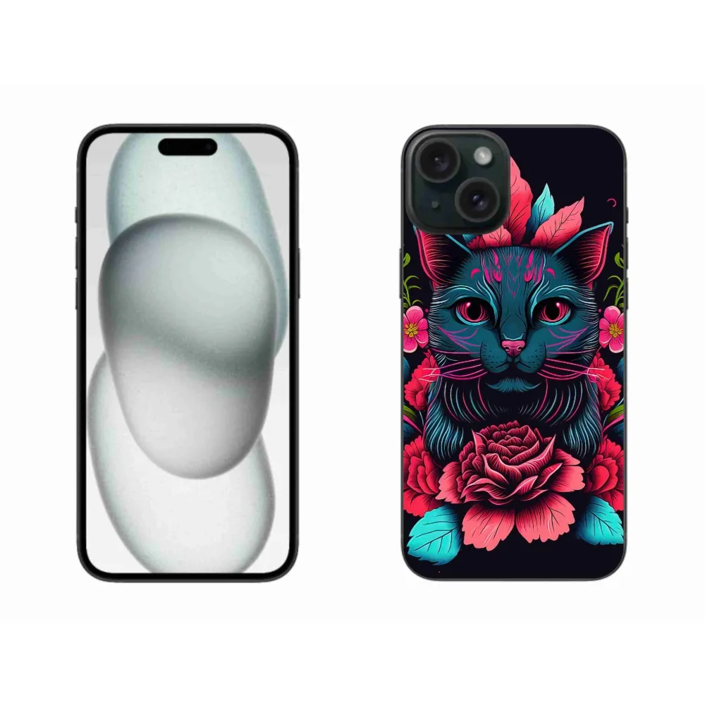 Gél borítás mmCase iPhone 15 Plus készülékhez - virágok és macska