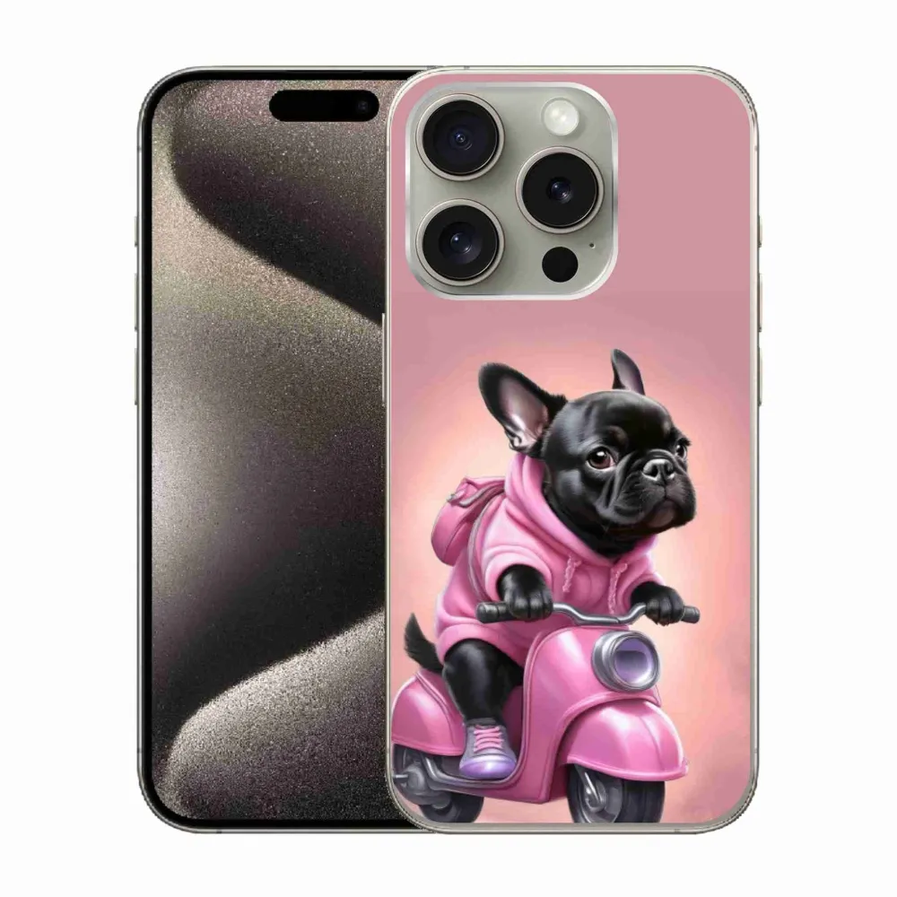 Gél borítás mmCase iPhone 15 Pro készülékhez - Francia bulldog egy robogón