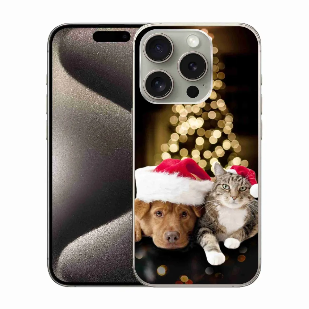 Rugalmas zselés tok mmCase képpel iPhone 15 Pro készülékhez - Karácsonyi kutya és macska