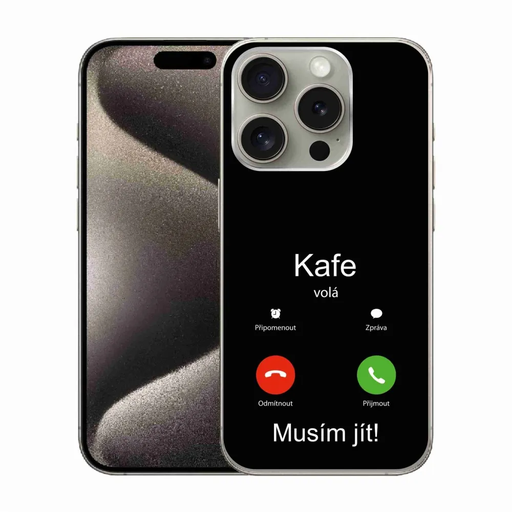 Rugalmas zselés tok mmCase képpel iPhone 15 Pro - kávé hívások fekete háttérrel