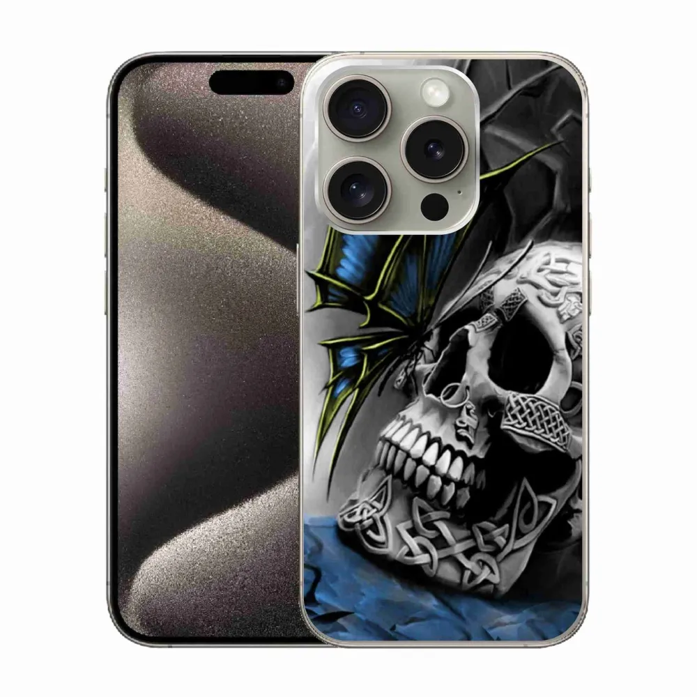 Rugalmas zselés tok mmCase kép iPhone 15 Pro - pillangó és koponya - képekkel
