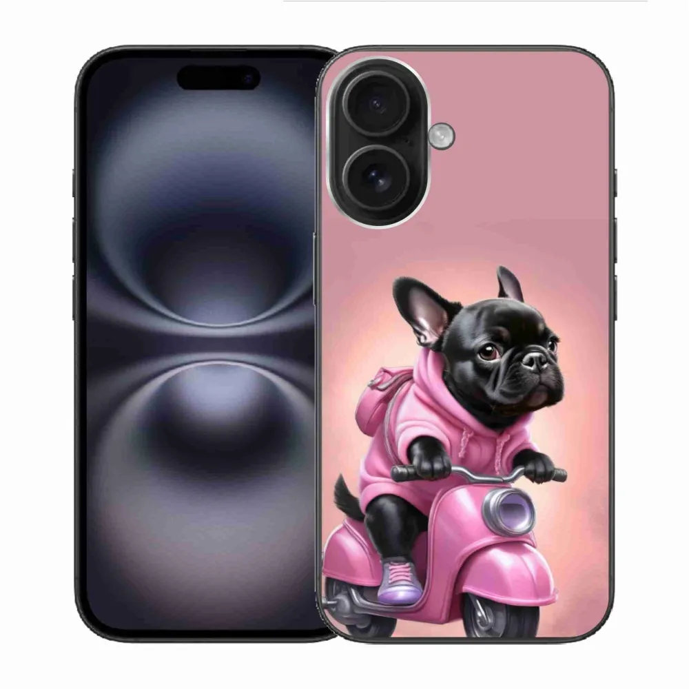 Rugalmas zselés tok mmCase képpel iPhone 16-hoz - Francia bulldog egy robogón
