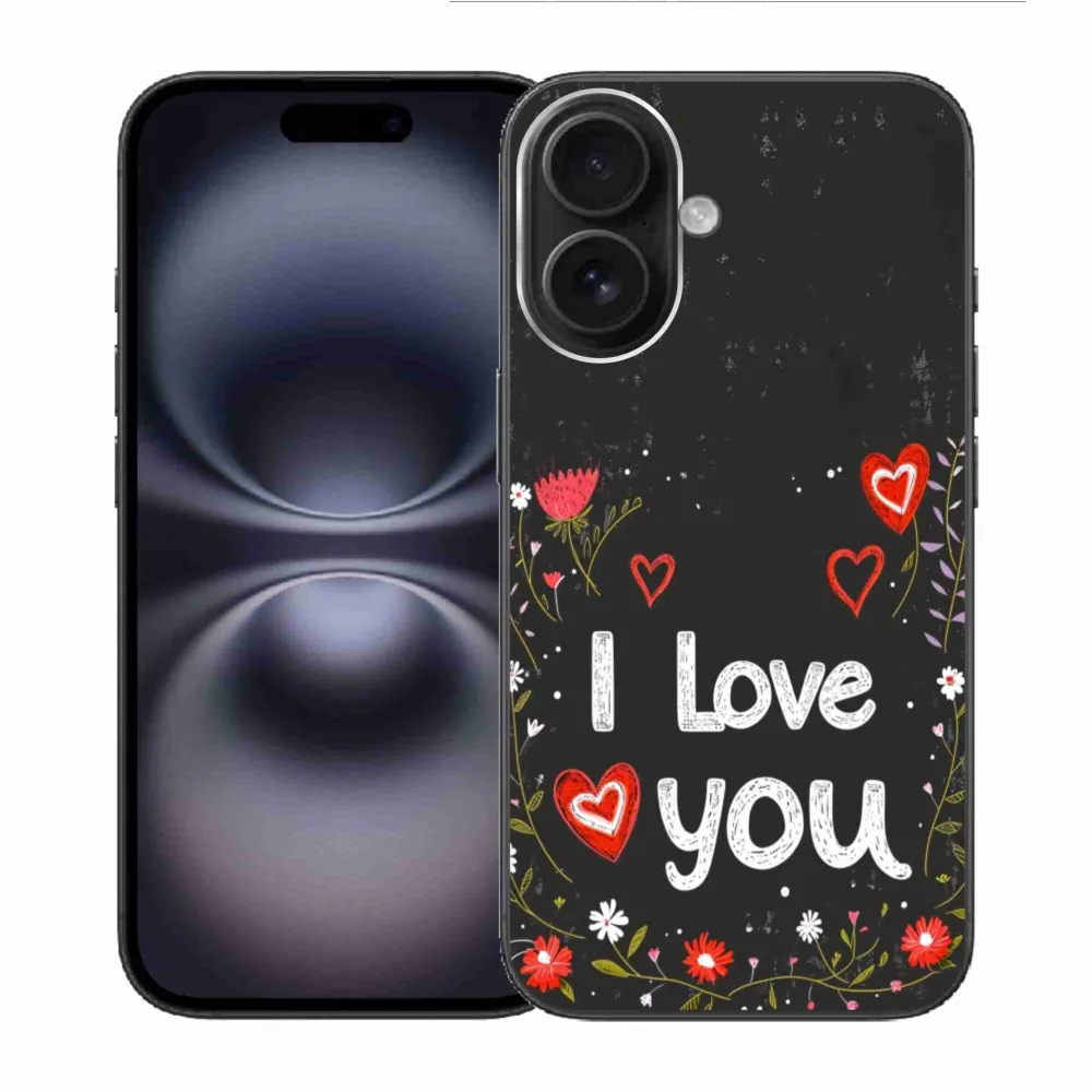 Rugalmas zselés tok mmCase képpel iPhone 16-hoz - I love you fekete háttérrel