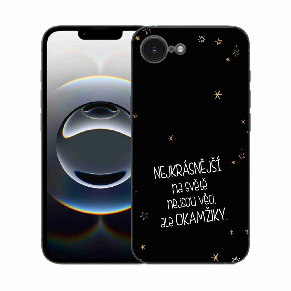 Rugalmas zselés tok mmCase képpel iPhone 16e - idézet 4 fekete háttérrel