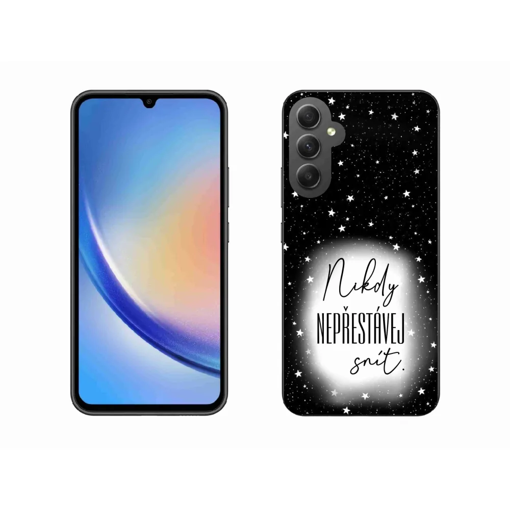 Rugalmas zselés tok mmCase a Samsung Galaxy A34 5G képével - idézet 1 fehér és fekete háttérrel