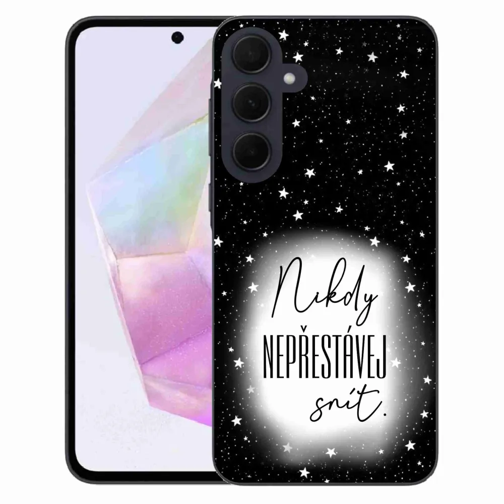 Rugalmas zselés tok mmCase a Samsung Galaxy A35 5G képével - idézet 1 fehér és fekete háttérrel