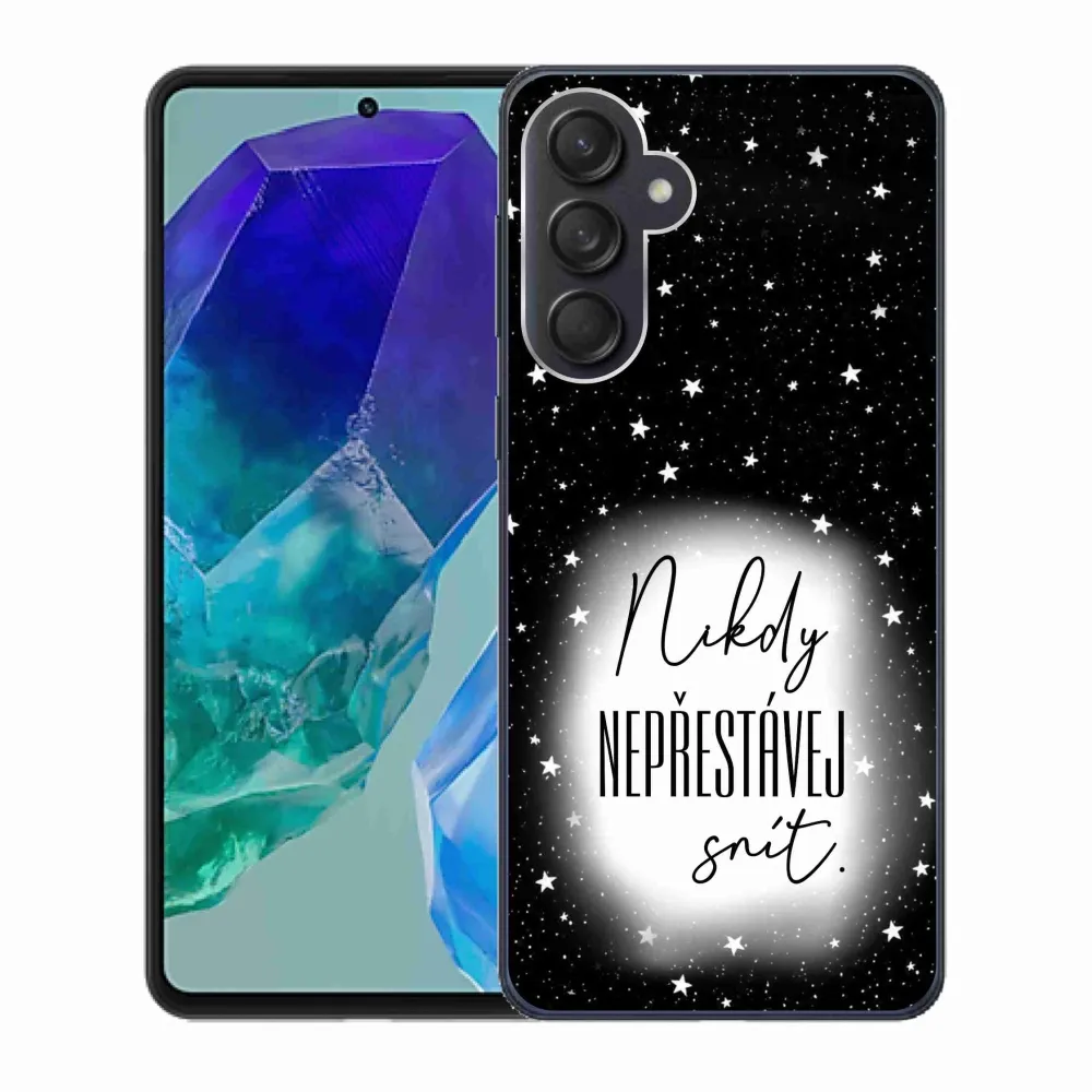 Rugalmas zselés tok mmCase a Samsung Galaxy M55 5G képével - idézet 1 fehér és fekete háttérrel
