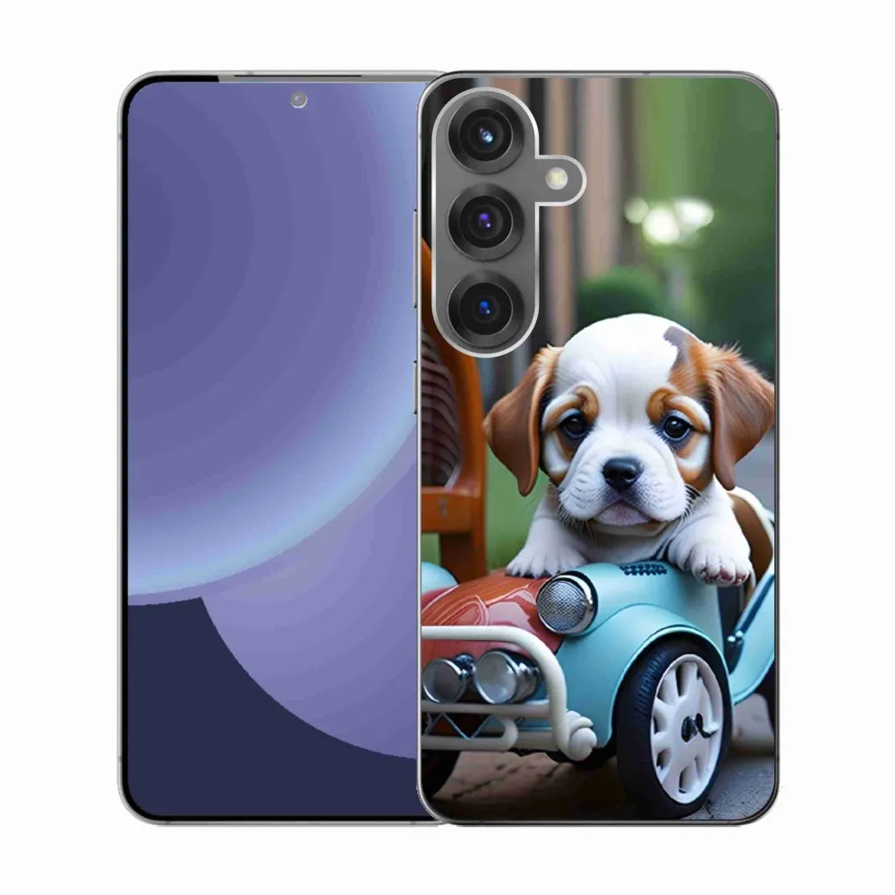 Gél borítás mmCase Samsung Galaxy S25 készülékhez - kiskutya egy retro autóban