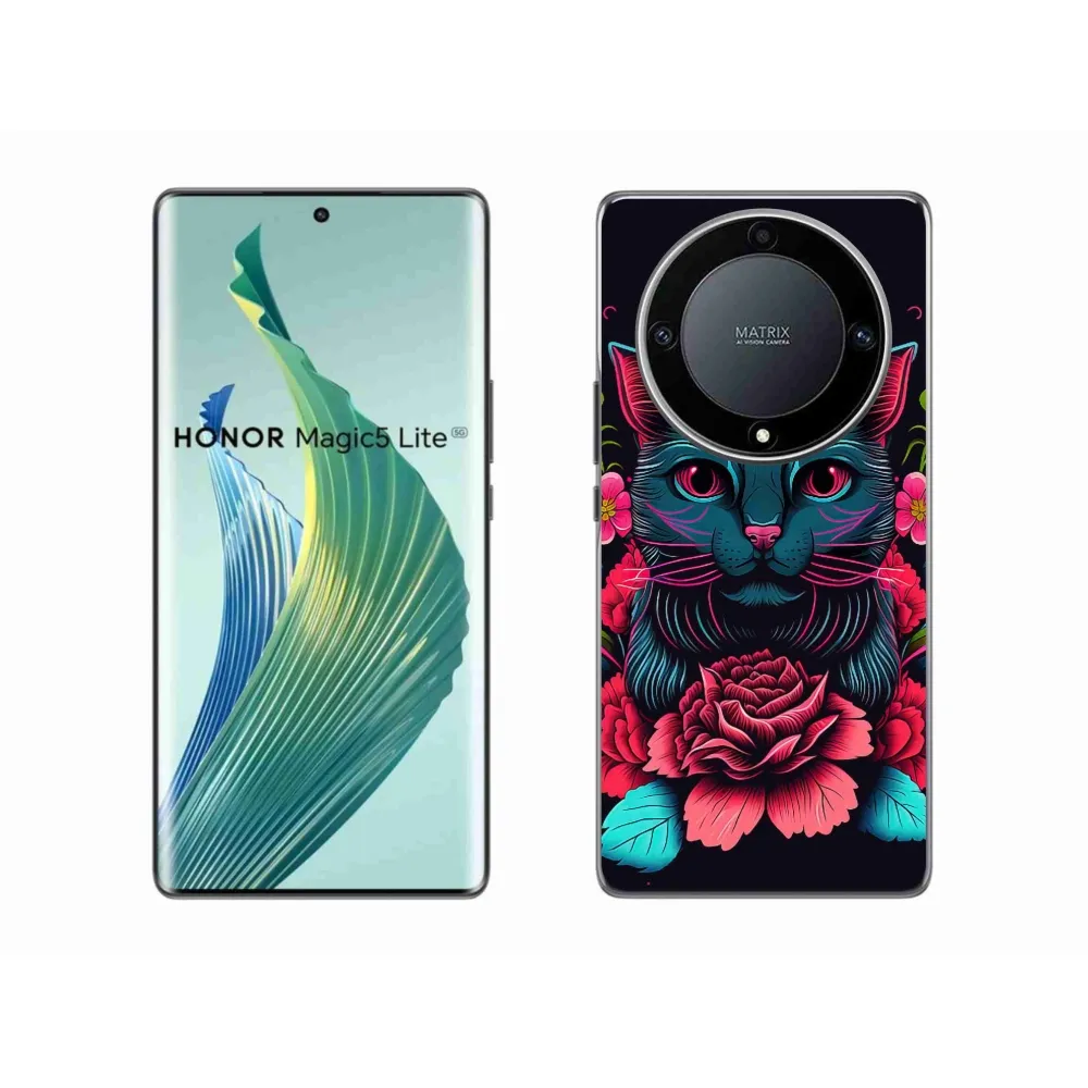 Gél borító mmCase a Honor Magic 5 Lite 5G számára - virágok és macska