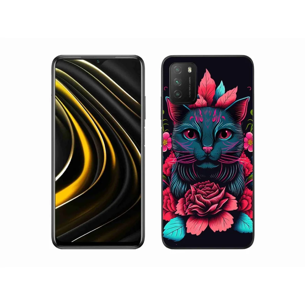 Rugalmas gél tok mmCase kép Xiaomi Poco M3 - virágok és macska - képekkel