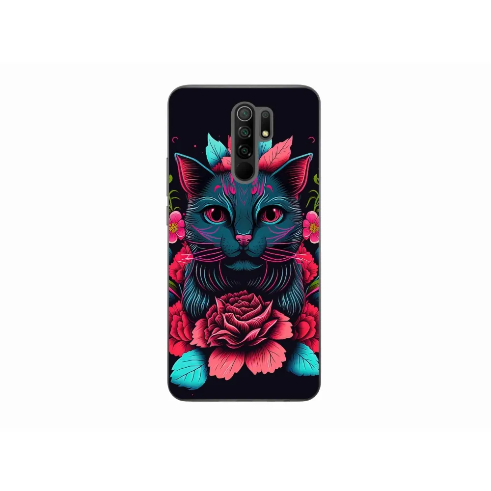 Gél borító mmCase a Xiaomi Redmi 9-hez - virágok és macska
