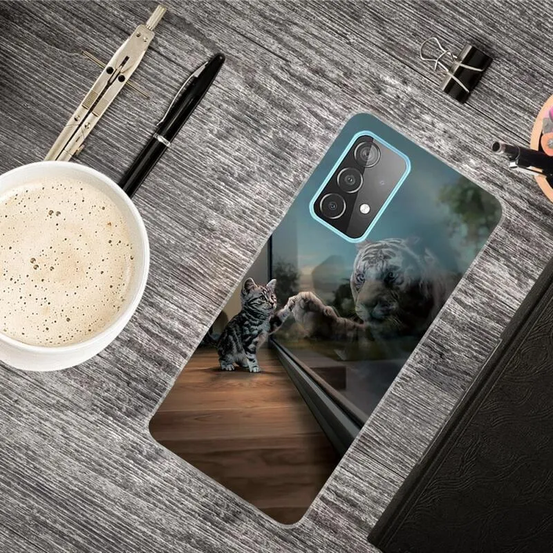 Szilikon tok Nyomtatás a Samsung Galaxy A53 5G mobiltelefonra, cica motívummal és a tigris tükörképével.