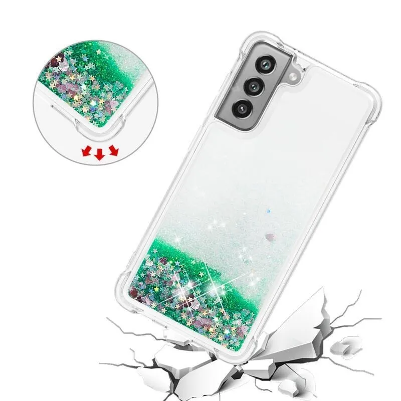 Glitter homokóra zselés tok Samsung Galaxy S21 FE 5G - zöld/szívek