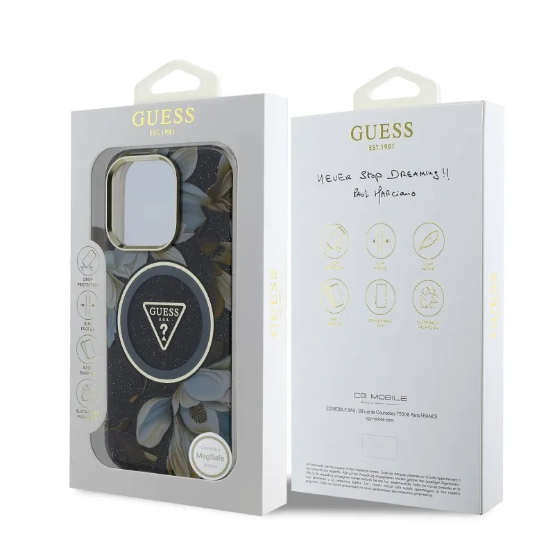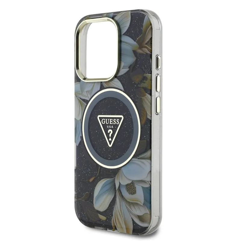 Guess IML Glitter Magnólia és háromszög logó MagSafe hátlap iPhone 16 Pro-hoz Fekete