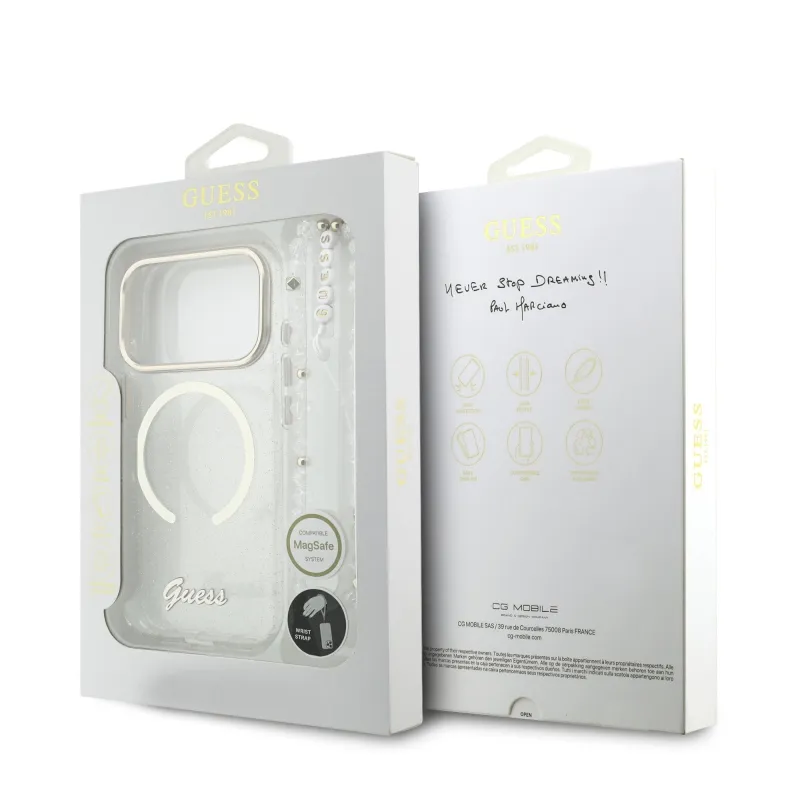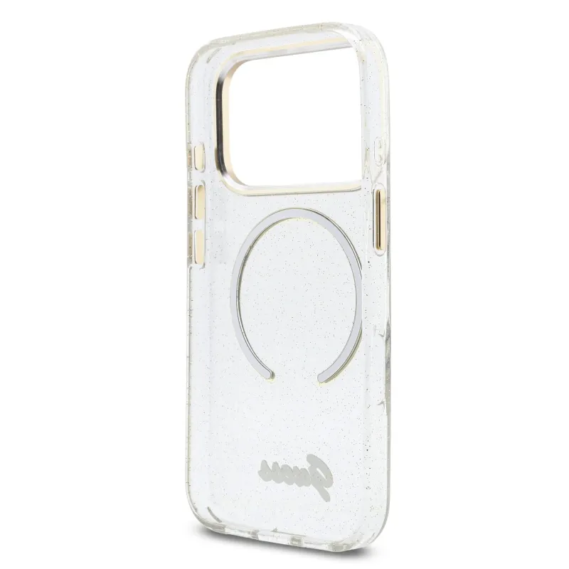 Guess IML Glitter Script Script Strap MagSafe hátlap iPhone 17 Pro átlátszóhoz