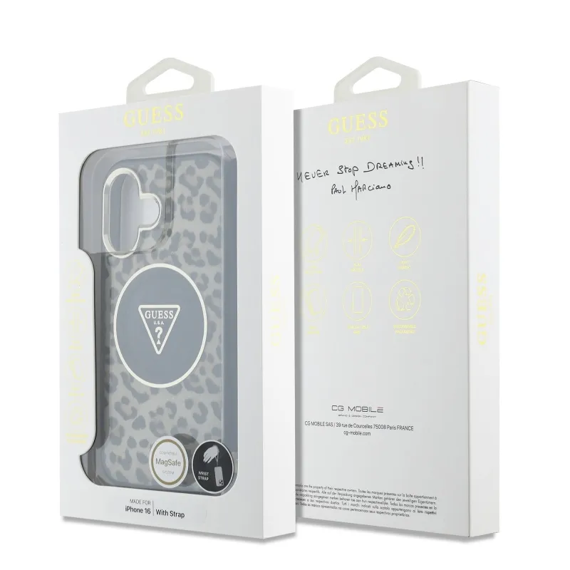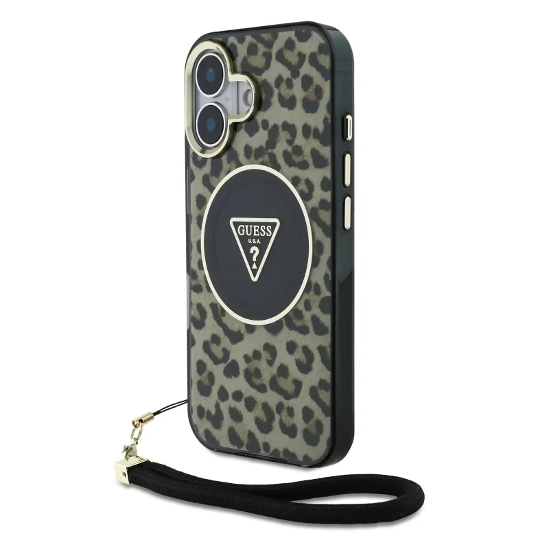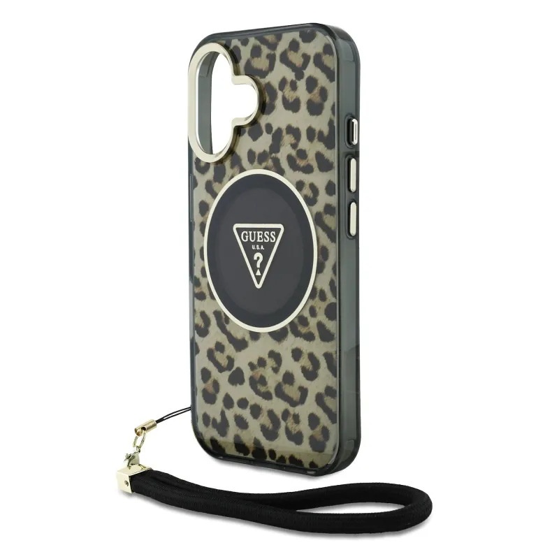 Guess IML Leopard Leopárd háromszög logó szíj MagSafe hátlap iPhone 16 barna