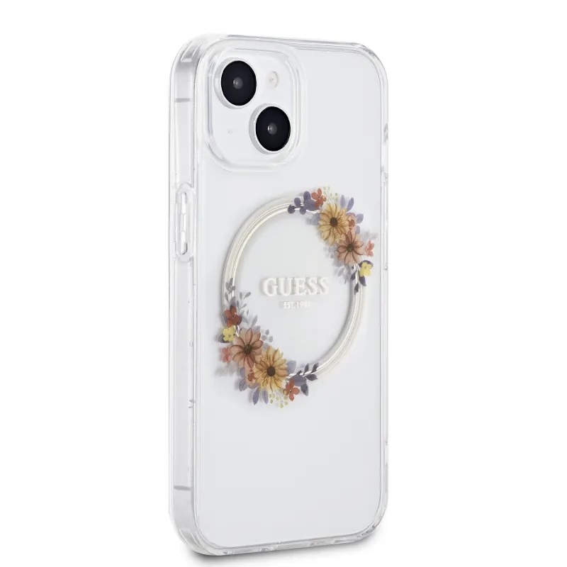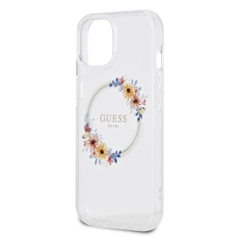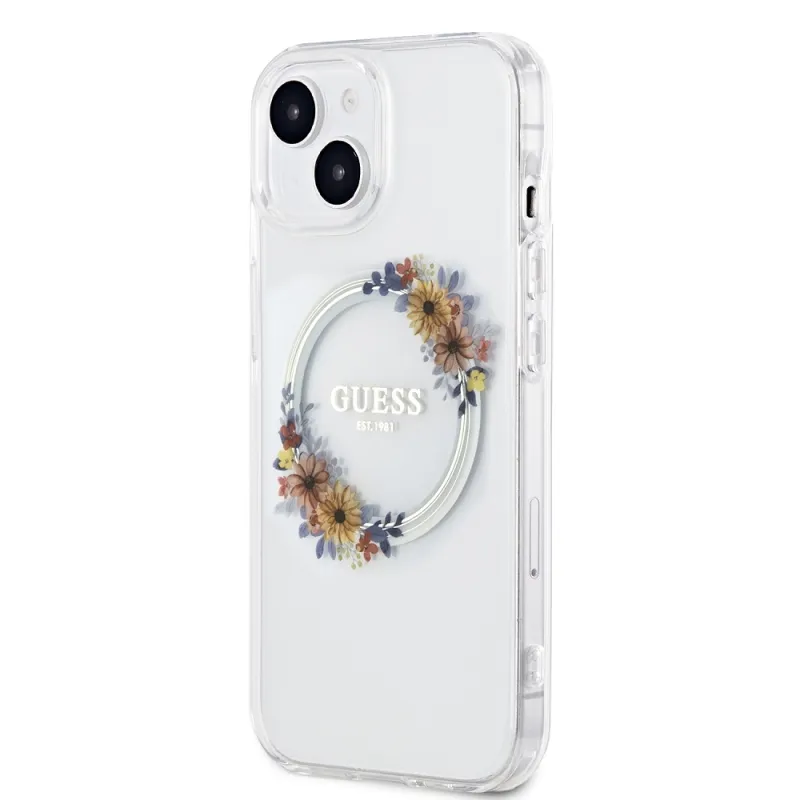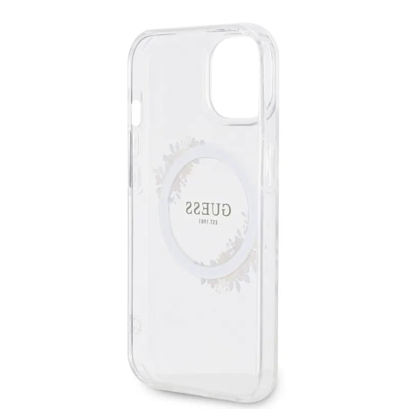 Guess PC/TPU Virágok gyűrű fényes logó MagSafe hátlap iPhone 15 Plus átlátszóhoz