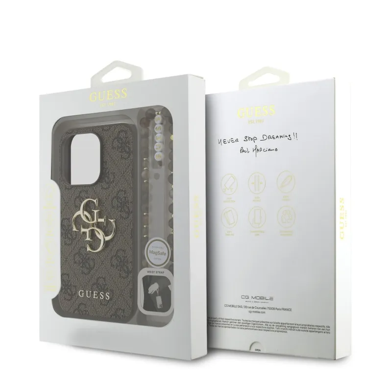 Guess PU 4G fém logós fém pánt hátlap iPhone 15 Pro Max barna színű borítóhoz