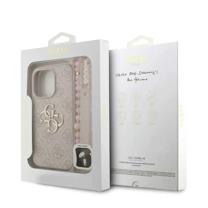 Guess PU 4G fém logós fém pánt hátlap iPhone 15 Pro Max rózsaszínű borítóhoz