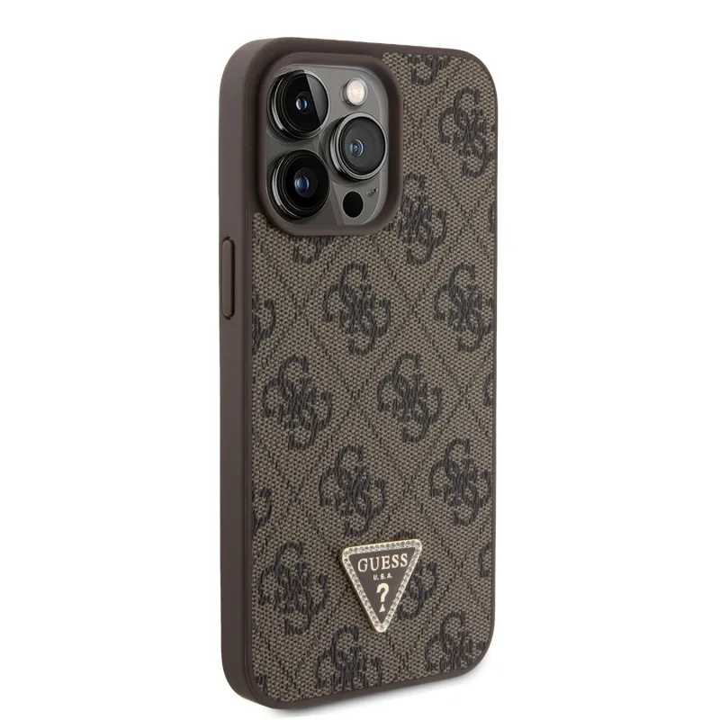 Guess PU 4G Strass háromszög fém logó hátlap iPhone 15 Pro Max barna színűre