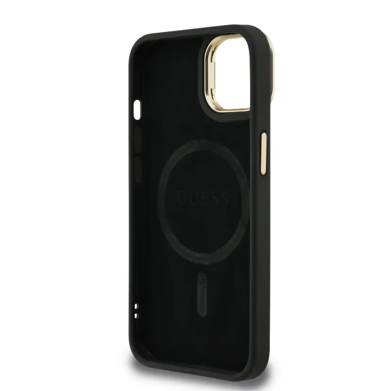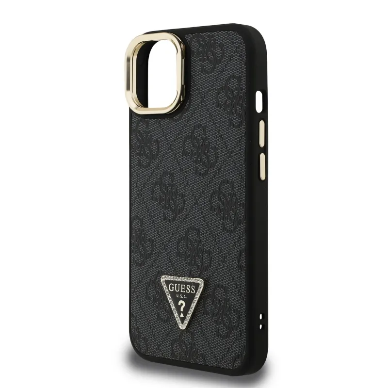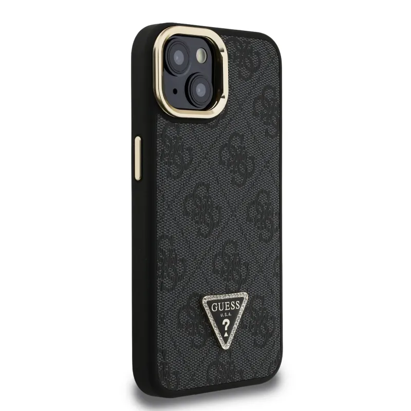 Guess PU 4G Strass háromszög logó állvány kamerakeret MagSafe hátlapi borító iPhone 13-hoz Fekete