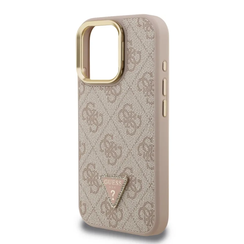 Guess PU 4G Strass háromszög logó állvány kamerakeret MagSafe hátlapi borító iPhone 15 Pro rózsaszínhez