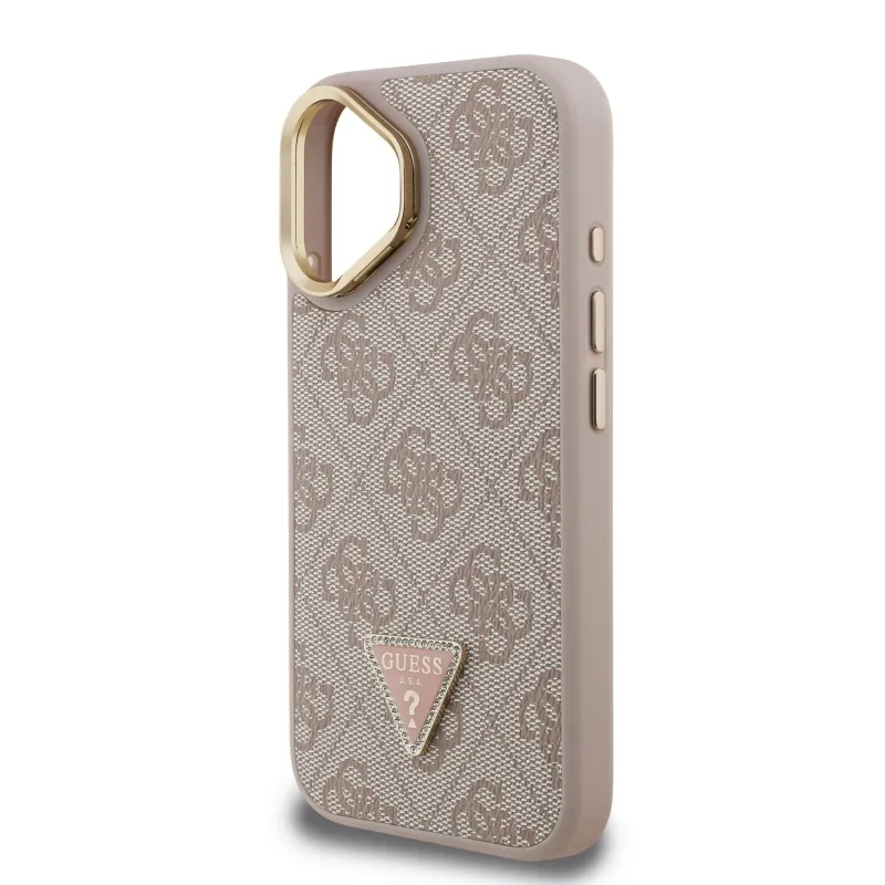 Guess PU 4G Strass háromszög logó állvány kamerakeret MagSafe hátlapi borító iPhone 16 rózsaszínhez