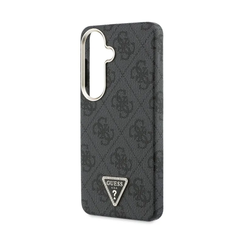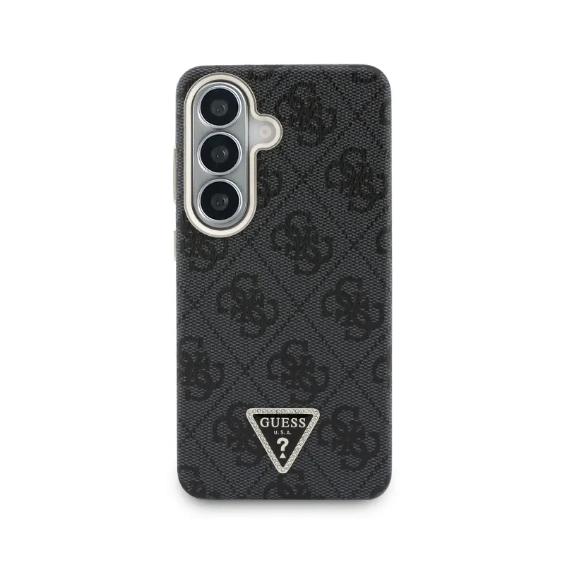 Guess PU bőr 4G Strass háromszög háromszög logó arany keret mágneses hátlap borító Samsung Galaxy S26 Fekete