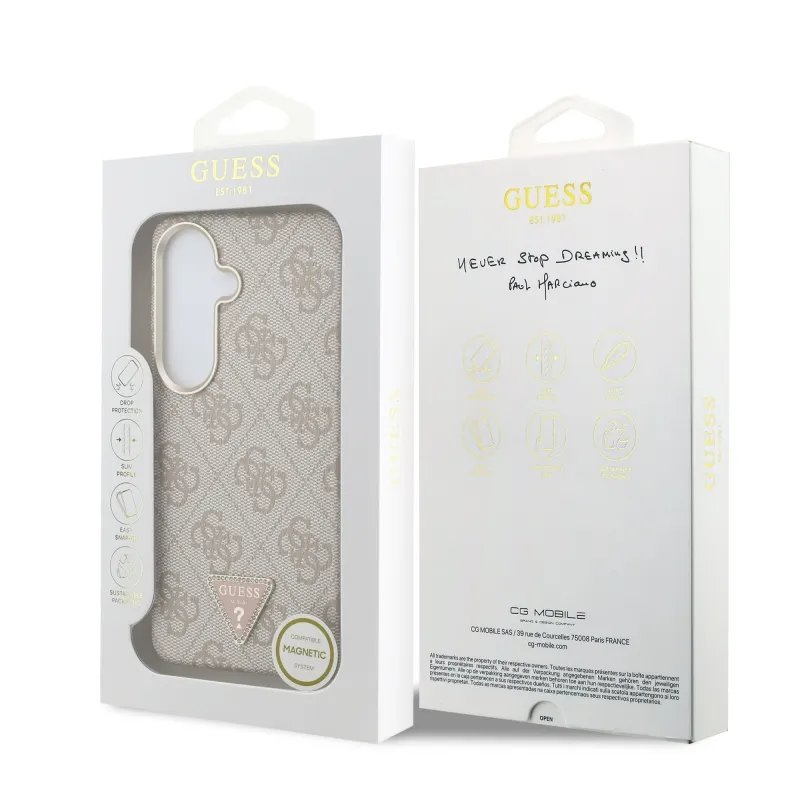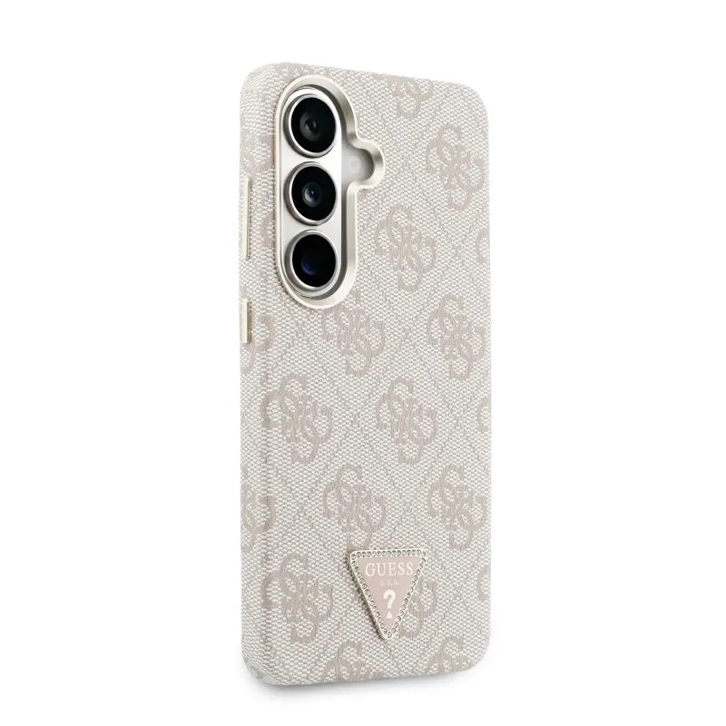Guess PU bőr 4G Strass háromszög háromszög logó arany keret mágneses hátlap borító Samsung Galaxy S26 rózsaszín